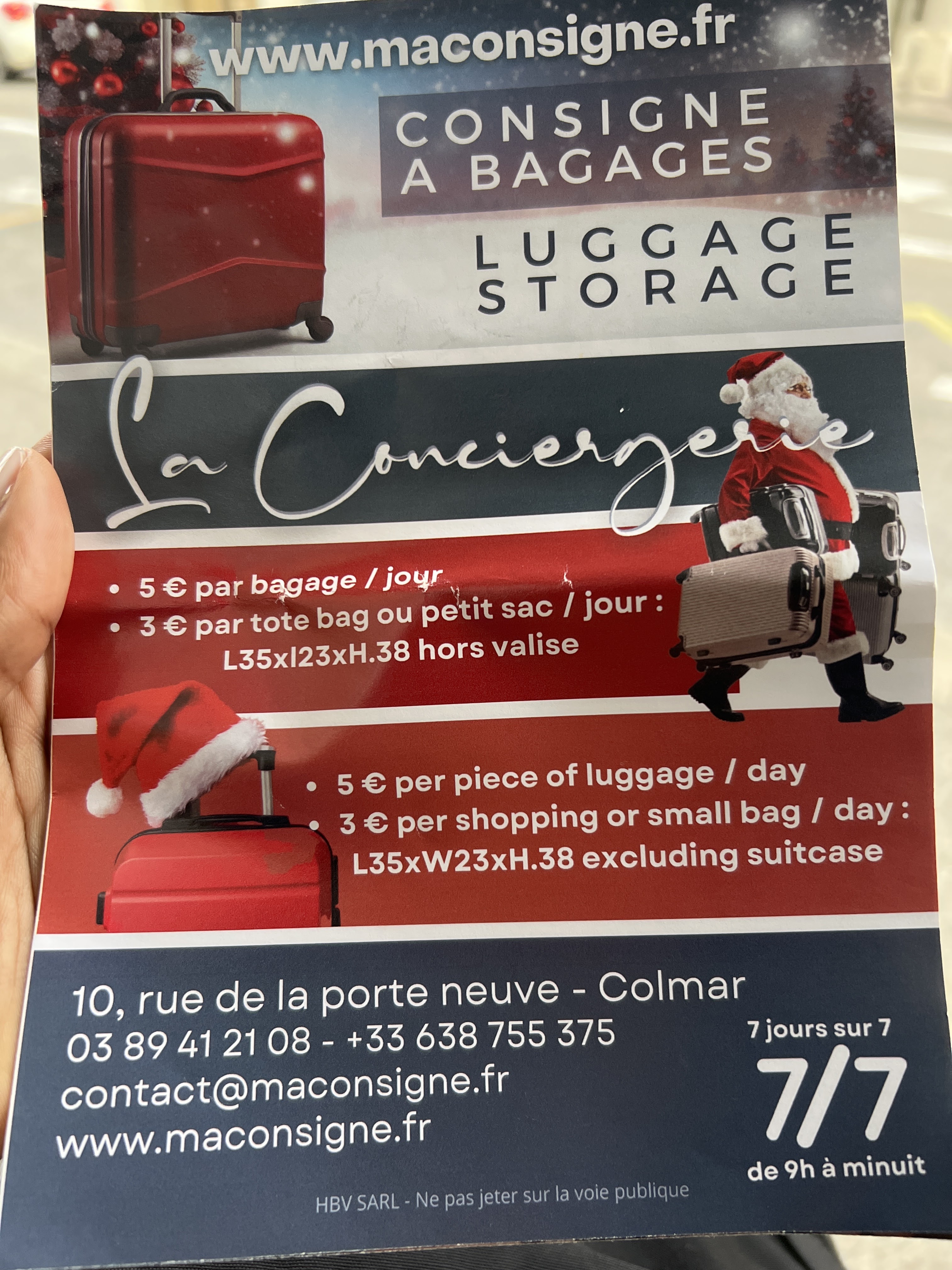 Le personnel était très gentil et arrangeant. Le service était également rapide ! Si vous souhaitez découvrir Colmar sans avoir à transporter de lourds bagages, je vous recommande vivement cet endroit.